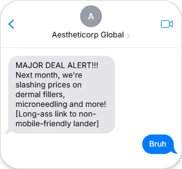 That’s kind of what having the “you should do SMS marketing” conversation with aesthetic practices is like, if we’re being honest. Some of you turn up your perfectly sculpted noses at the prospect of sky-high engagement rates, and darn it, we’re not gonna take it anymore.