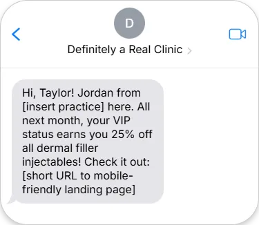 In most cases, SMS is not the time or place to drag things out. Lead with the savings. If it’s $100 off x treatment, tell them! If you’re competing more on expertise and experience for a premium surgical procedure, then it’s much more reasonable to leave out price, but this isn’t the ideal application of SMS marketing to begin with.
